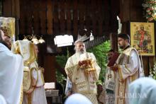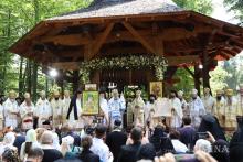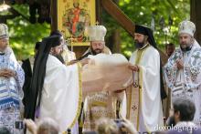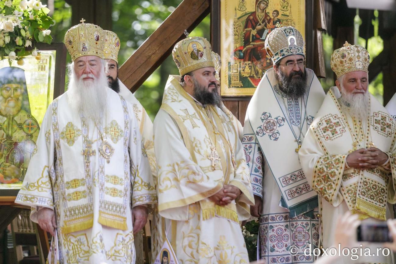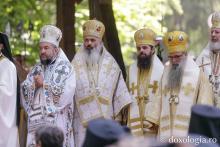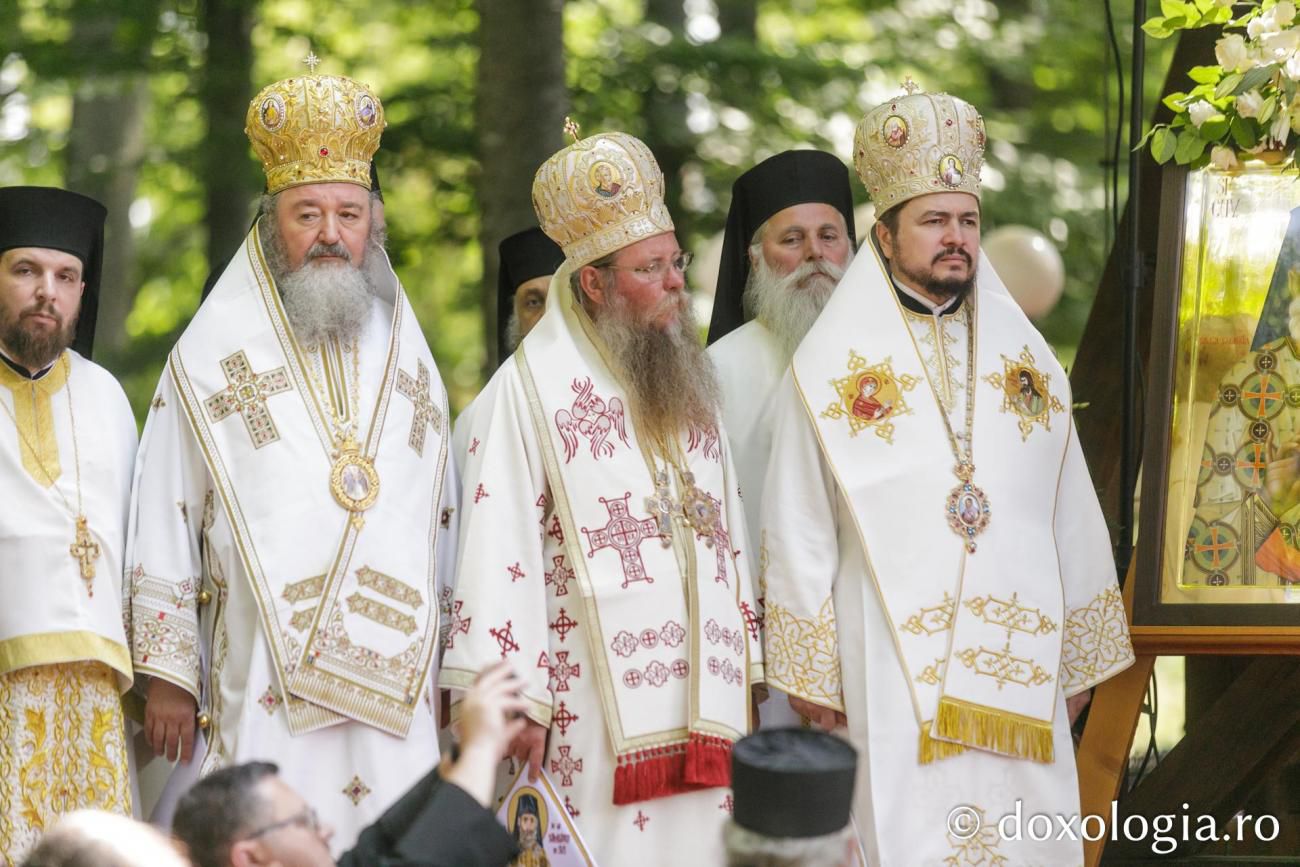 Sfânta Liturghie a fost săvârşită la altarul din pădure al mănăstirii, iar în soborul de arhierei s-au aflat: