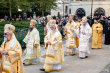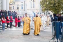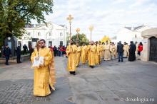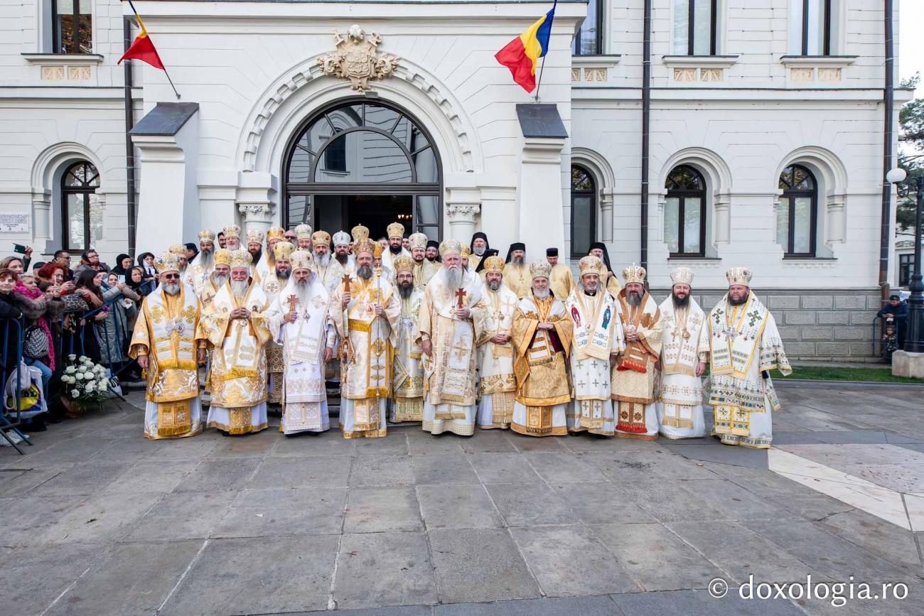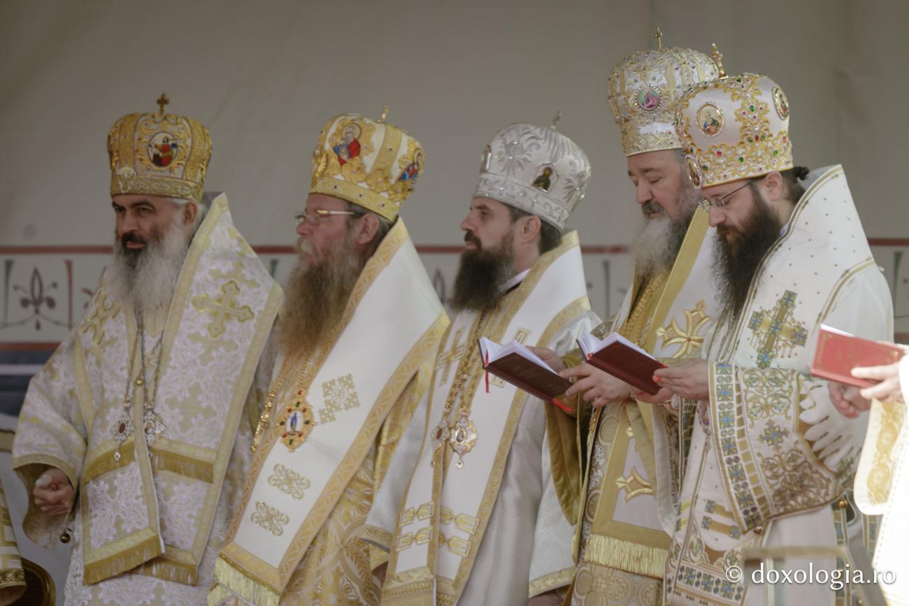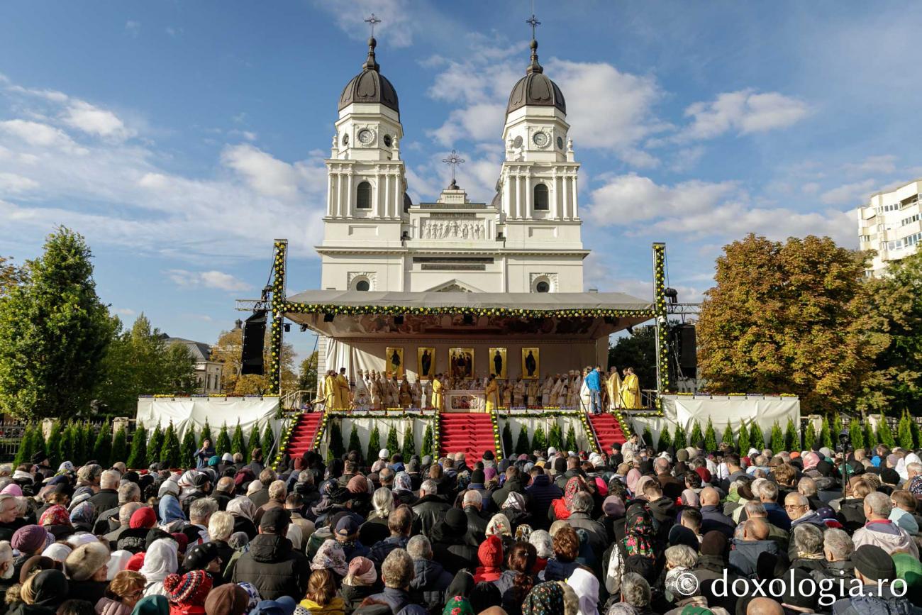 Sfânta Liturghie, a fost săvârșită pe podiumul special amenajat la limita cu Pietonalul Ștefan cel Mare și Sfânt, în dreptul altarului Catedralei Mitropolitane, de un sobor de 27 de ierarhi, preoți și diaconi, atât din țară, cât și din străinătate. Slujba săvârșită în cinstea Ocrotitoarei Moldovei a fost oficiată de Înaltpreasfinţitul Părinte Filoteos, Mitropolit de Tesalonic. Din soborul arhiereilor au făcut parte Înaltpreasfinţitul Părinte Ioanichie, Arhiepiscop de Cetinie şi Mitropolit de Muntenegru şi Litoral, Înaltpreasfinţitul Părinte Teofan, Arhiepiscopul Iaşilor şi Mitropolitul Moldovei şi Bucovinei, Înaltpreasfinţitul Părinte Anastas, Mitropolit de Korca, Înaltpreasfinţitul Părinte Irineu, Arhiepiscopul Craiovei şi Mitropolitul Olteniei, Înaltpreasfinţitul Părinte Teodosie, Arhiepiscopul Tomisului, Înaltpreasfinţitul Părinte Ciprian, Arhiepiscopul Buzăului şi Vrancei, Înaltpreasfinţitul Părinte Casian, Arhiepiscopul Dunării de Jos, Înaltpreasfinţitul Părinte Atanasie, Arhiepiscop Ortodox Român al Marii Britanii şi Irlandei de Nord, Preasfinţitul Părinte Qais, Episcop de Erzurum, Preasfinţitul Părinte Ignatie, Episcopul Huşilor, Preasfinţitul Părinte Nicodim, Episcopul Severinului şi Strehaiei, Preasfinţitul Părinte Antonie, Episcopul de Bălți, Preasfinţitul Părinte Veniamin, Episcopul Basarabiei de Sud, Preasfinţitul Părinte Andrei, Episcopul Covasnei şi Harghitei, Preasfinţitul Părinte Galaction, Episcopul Alexandriei şi Teleormanului, Preasfinţitul Părinte Benedict, Episcopul Sălajului, Preasfinţitul Părinte Nestor, Episcopul Devei şi Hunedoarei, Preasfinţitul Părinte Ieronim, Episcopul Daciei Felix, Preasfinţitul Părinte Macarie, Episcopul Ortodox Român al Europei de Nord, Preasfinţitul Părinte Nectarie, Episcopul Ortodox Român al Irlandei şi Islandei, Preasfinţitul Părinte Nichifor Botoşăneanul, Episcop-vicar al Arhiepiscopiei Iaşilor, Preasfinţitul Părinte Paisie Lugojanul, Episcop-vicar al Arhiepiscopiei Timişoarei, Preasfinţitul Părinte Damaschin Dorneanul, Episcop-vicar al Arhiepiscopiei Sucevei și Rădăuților, Preasfinţitul Părinte Emilian Crișanul, Episcop-vicar al Arhiepiscopiei Aradului, Preasfinţitul Părinte Timotei Sătmăreanul, Arhiereu-vicar al Episcopiei Ortodoxe Române a Maramureşului şi Sătmarului, Preasfinţitul Părinte Gherontie Hunedoreanul, Arhiereu-vicar al Episcopiei Devei şi Hunedoarei.