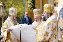 După otpustul Sfintei Liturghii, rostit în greacă de Patriarhul Ecumenic Bartolomeu, Preafericitul Părinte Patriarh Daniel a anunţat citirea Actului sinodal de aniversare a Bisericii Ortodoxe Române. Documentul în care este menționată atât recunoașterea Autocefaliei din anul 1885, cât și ridicarea la rang de Patriarhie din anul 1925 a fost citit solemn de Preasfințitul Părinte Varlaam Ploieșteanul, secretarul Sfântului Sinod.