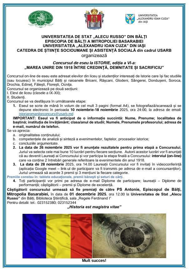 UNIVERSITATEA DE STAT „ALECU RUSSO” DIN BĂLȚI, EPISCOPIA DE BĂLȚI A MITROPOLIEI BASARABIEI, UNIVERSITATEA „ALEXANDRU IOAN CUZA” DIN IAȘI, CATEDRA DE ȘTIINȚE SOCIOUMANE ȘI ASISTENȚĂ SOCIALĂ din cadrul USARB organizează Concursul de eseu la ISTORIE, ediția a VI-a: „MAREA UNIRE DIN 1918 ÎNTRE CREDINȚĂ, DEMNITATE ȘI SACRIFICIU”.